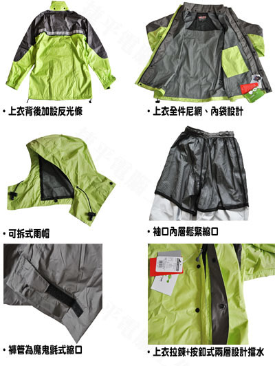 雨帽採本布帽眉,雨帽前沿以魔術膠帶調整扣合,下沿釘塑鋼壓釦可與衣身結合分離。