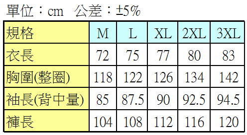 上衣內裡採用全裡尼網,兩袖口以魔術膠帶調整袖口大小。